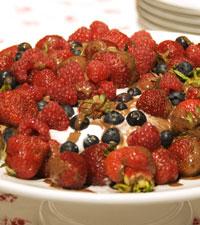 Glass och bär med grädde och chokladsås