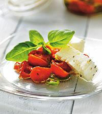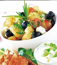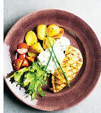 Grillat kycklingbröst med ugnsstekt potatis och äppel- och gurksås
