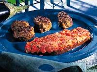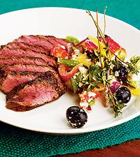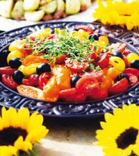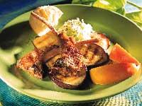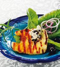 Grillad halloumi med olivsmör, rödlök och romansallad