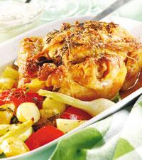 Helstekt kyckling med ugnsstekta grönsaker och fetaostsås