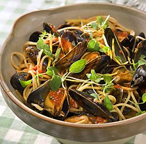 Spagetti med tomat och blåmusslor