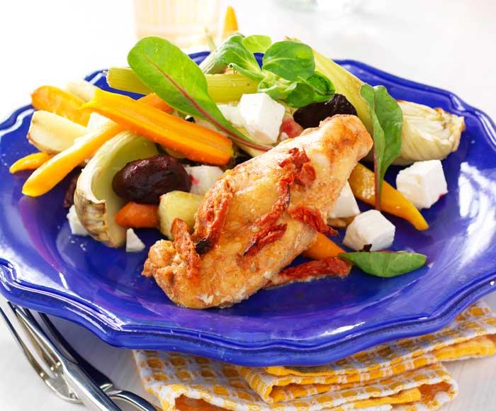 Kycklingbröstfilé med Västerbottensost och soltorkade tomater med höstgrönsaker