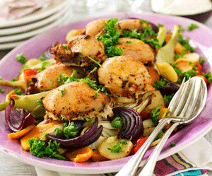 Kycklinglårfiléer med krämig fetaost och höstgrönsaker