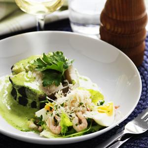Kokt torsk med ägg- och räksallad