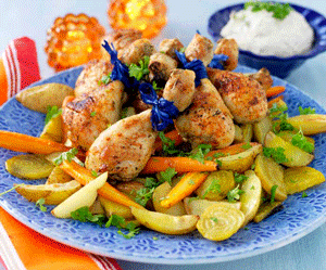 Örtmarinerade kycklingben med rostade rotfrukter