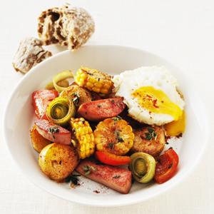 Falukorvspanna med stekta ägg