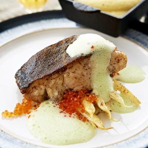 Rimmad torsk med grönt ärtskum och forellrom