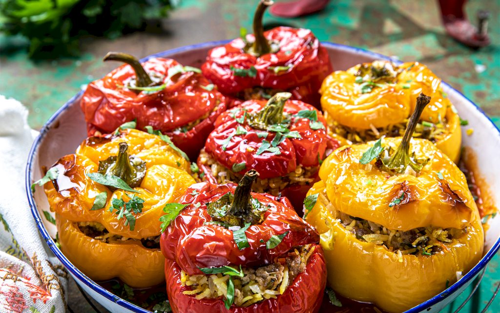 Färgglada fyllda paprikor med kött- och chorizofärs