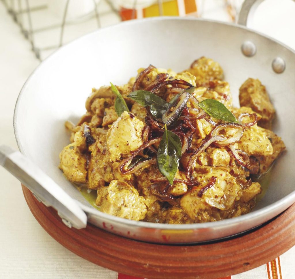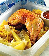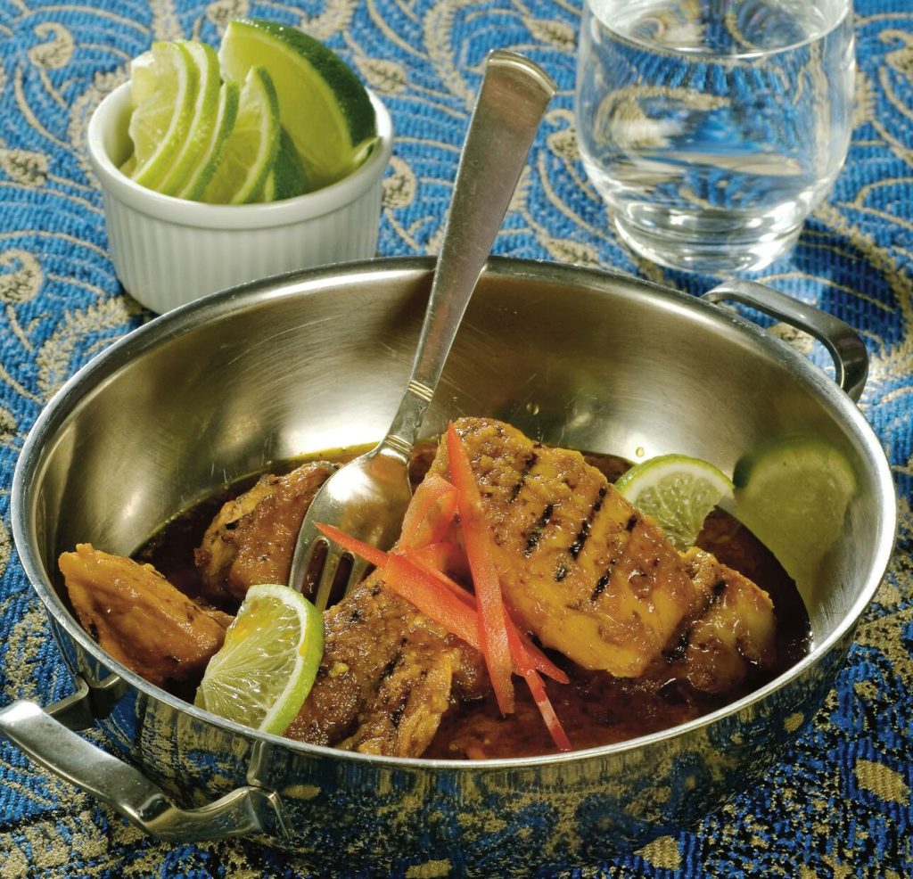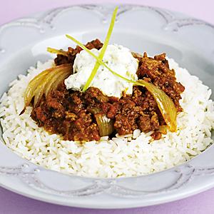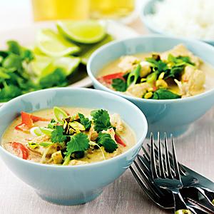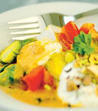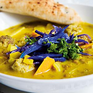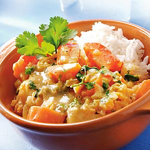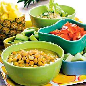 Kikärtscurry med råris grönsaker, frukt och sallad