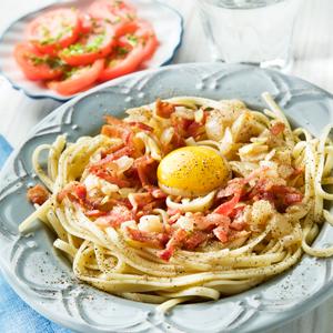 Spaghetti carbonara med tomatsallad