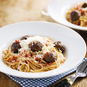 Örtiga köttbullar i sås med spagetti