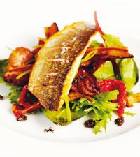 Halstrad seabassfilé med kantarell- och pancettasallad
