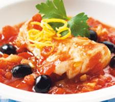 Fisk i tomatsås med lök och oliver