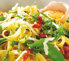 Tagliatelle med fläsk och sockerärter