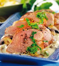 Helstekt fläskfilé med champinjoner i gorgonzolasås