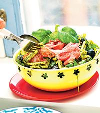 Grönpestopasta med lufttorkad skinka