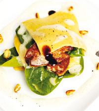 Öppen lasagne med kycklinglever, spenat, pinjenötter och parmesan