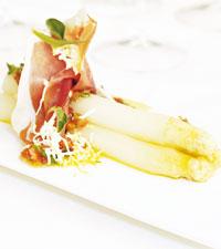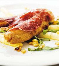 Abborrfilé med pata negra, vit sparris och pinjenötter
