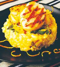 Apelsin- och fänkålsrisotto serverad till pilgrimsmusslor
