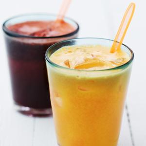 Äppel-, apelsin- och morotsjuice med färsk ingefära