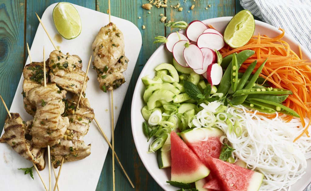 Kycklingspett med nudelsallad