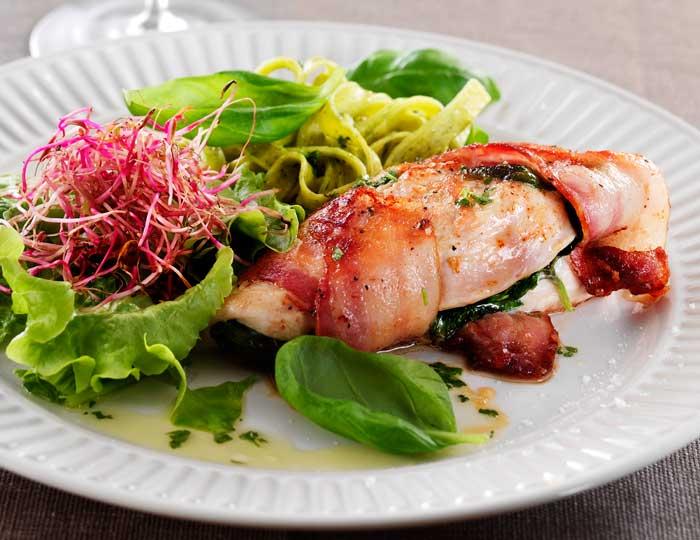Kryddiga kycklingfiléer med bacon och riven choklad