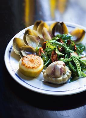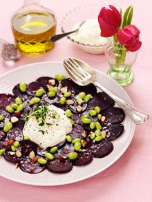 Rödbetscarpaccio med edamame och pepparrotskräm