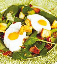 Bladspenatsallad med pancetta och pocherade ägg