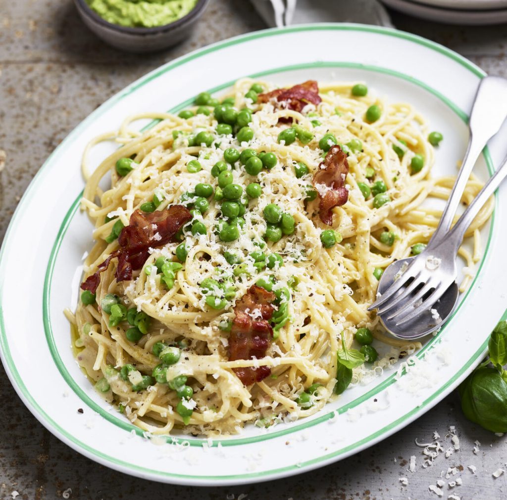 Pasta carbonara med grön ärtpesto