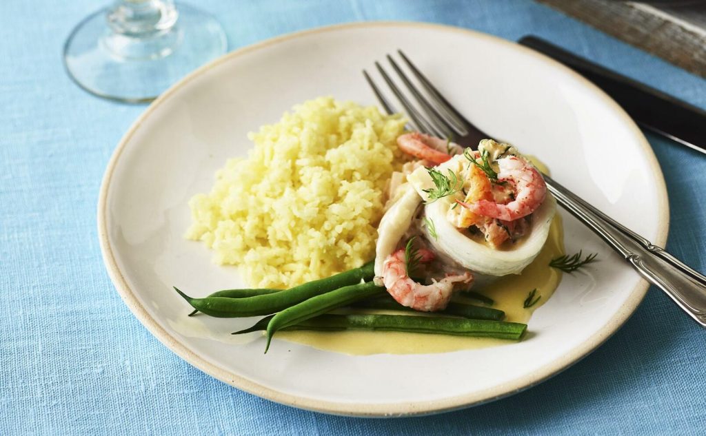 Ugnsbakad spätta med räkfyllning och vitvinssås