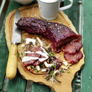 Rödbetsgravad kalvfilé med nobissås samt äpple- & skottsallad