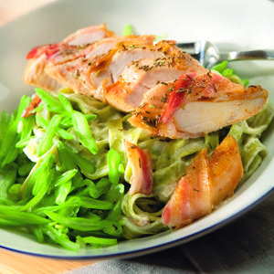Baconlindad kyckling med kantarellpasta