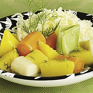 Rotsaksfrikassé i syrlig dillsås