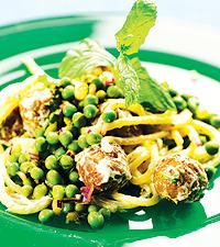 Spagetti med färskost, kycklingbullar, färsk mynta och gröna ärtor