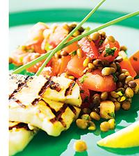 Lins- och tomatsallad med grillad halloumi