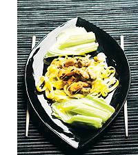 Pasta med musslor och lättkokt purjolök