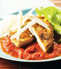 Kycklingpiccata med tomatsås, jasminris och romansallad