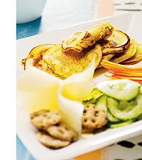 Potatisplättar till råriven morot, gurka och ost