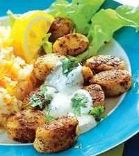 Currystekta fiskbullar med morotsris och korianderraita