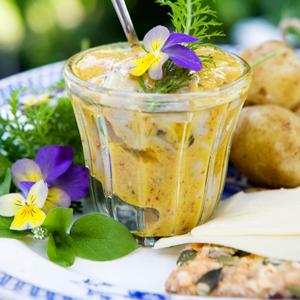 Sill i senapssås med ogräs och viol