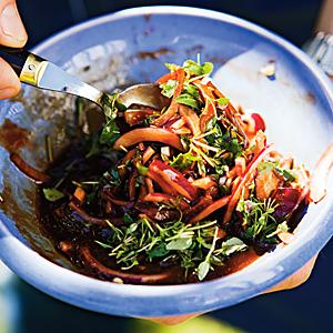 Vietnamesisk sallad och jordgubbskräm med mascarpone och ingefära