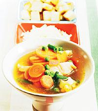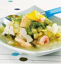 Fisksoppa med grönsaker och knapriga brödtärningar