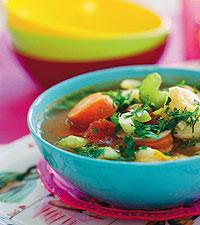 Grönsakssoppa med basilikaröra på bröd