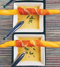 Olivsoppa med serranolindade brödpinnar