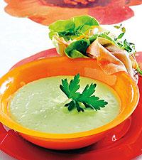 Kall avokadosoppa och macka med lufttorkad skinka