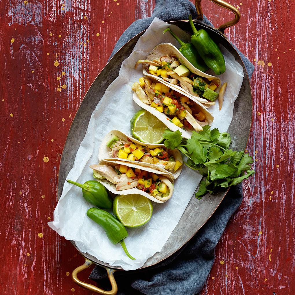 Taco på majstortilla, kyckling, tomat- och mangosalsa