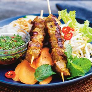Vietnamesiskt karréspett med örtsallad och jordnötter