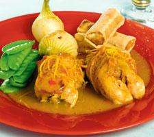 Apelsinbräserad kycklinglårfilé med vårrullar och sockerärter