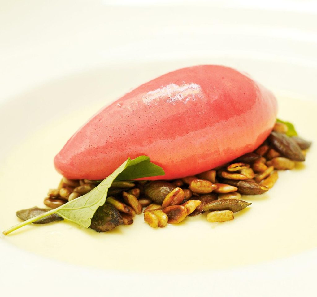 Vit chokladpannacotta med hallonsorbet