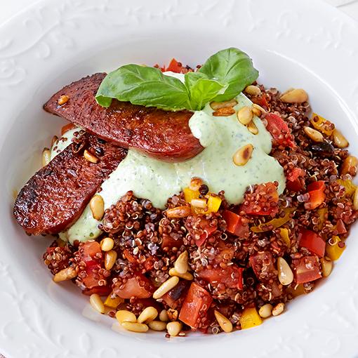 Kryddig korv med varm quinoasallad